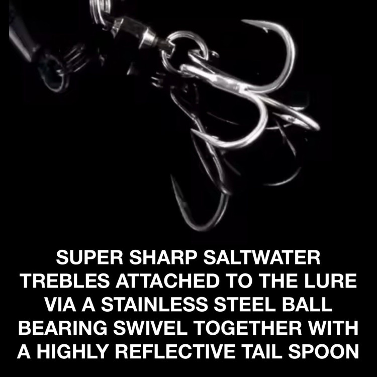 The super sharp saltwater treble hook is attached via a stainless steel ball bearing swivel along with the tail blade, this allows the blade to spin while also making it much harder for hooked fish to escape.
