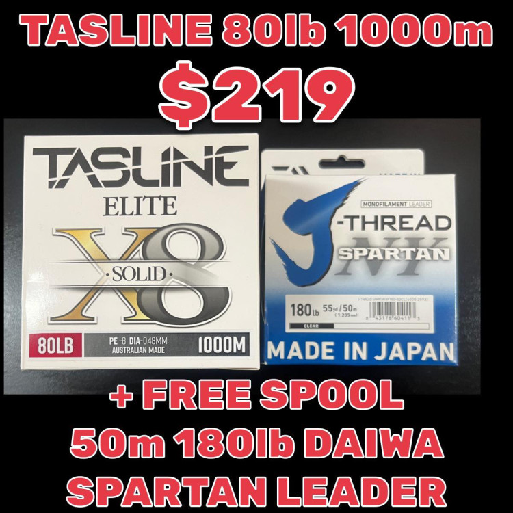 Home > ONLINE STORE > LINE & BRAID > BRAID > TASLINE ELITE BRAID LINE > Tasline 80lb 1000m / Plus Bonus Spool of Daiwa Spartan 180lb 50m Leader Line - Only $219