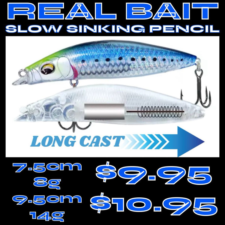 Home > ONLINE STORE > LURES > POPPERS STICKBAITS TOP WATER LURES GT FISHING KINGFISH TUNA BREAM WHITING COD ETC > Real Bait Long Cast Mini Pencil Lures